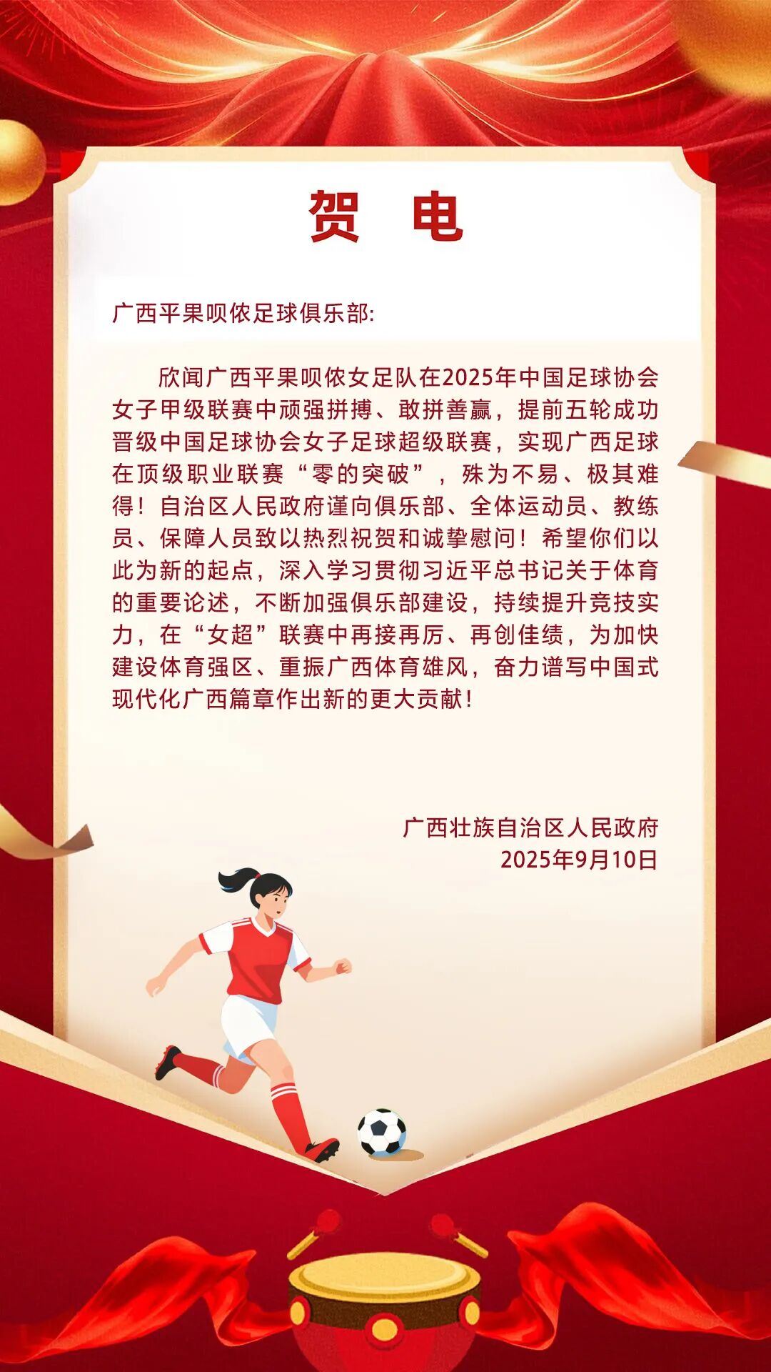 近日,广西平果呗侬足球俱乐部在2025年中国足球协会女子甲级联赛中,提前五轮成功晋级中国足球协会女子足球超级联赛,实现广西足球在顶级职业联赛“零的突破”。 9月10日,广西壮族自治区人民政府向广西平果呗侬足球俱乐部致贺电,全文如下: