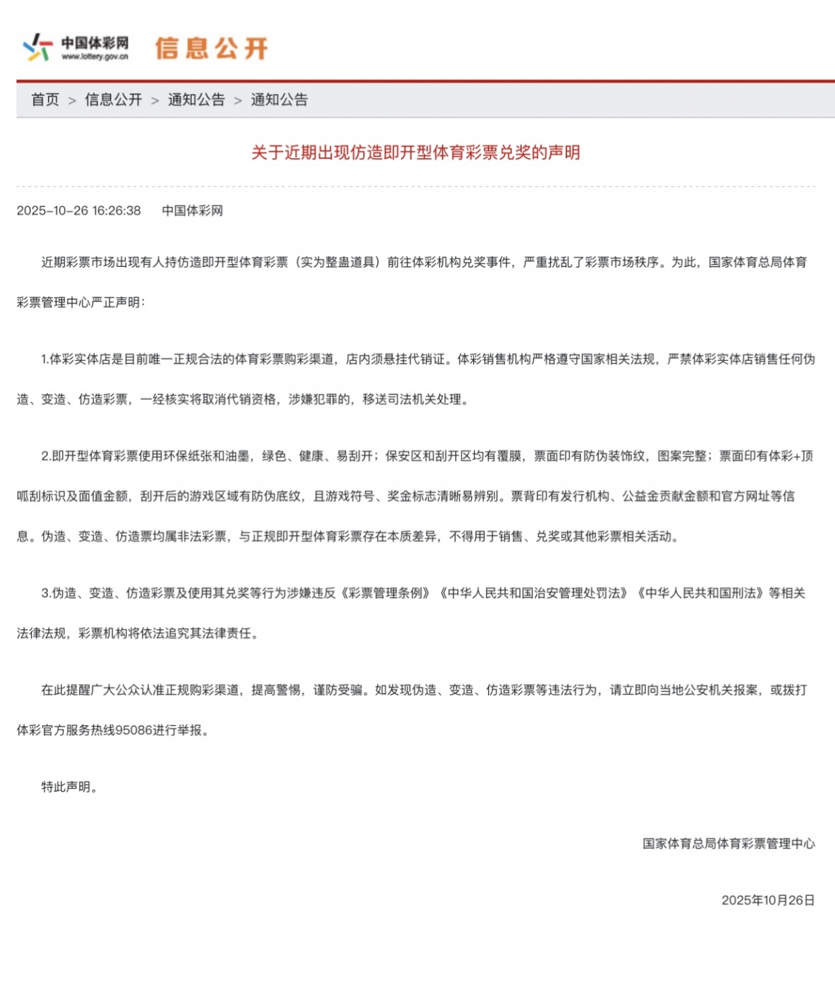 10月28日,央视《朝闻天下》栏目报道了一则关乎每位购彩者切身利益的重要新闻——国家体彩中心正式发布了《关于近期出现仿造即开型体育彩票兑奖的声明》,揭示了近期彩票市场上有不法分子利用仿造的即开型体育彩票(实为整蛊道具)试图在体彩机构进行兑奖,此举不仅严重扰乱了正常的彩票市场秩序,也对广大购彩者的权益构成了潜在威胁。